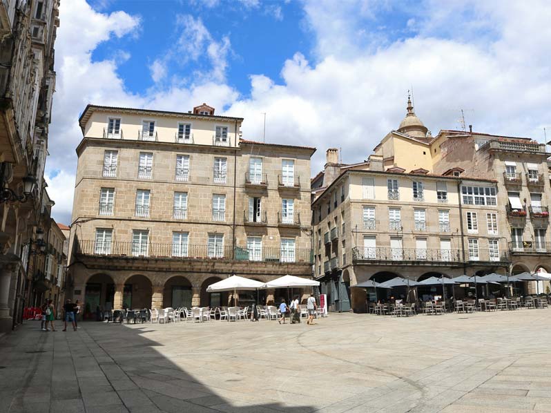 Cette place spacieuse et légèrement inclinée est dominée par la mairie (Casa do Concello) et entourée d’anciens bâtiments nobiliaires avec des arcades qui lui confèrent un charme médiéval.